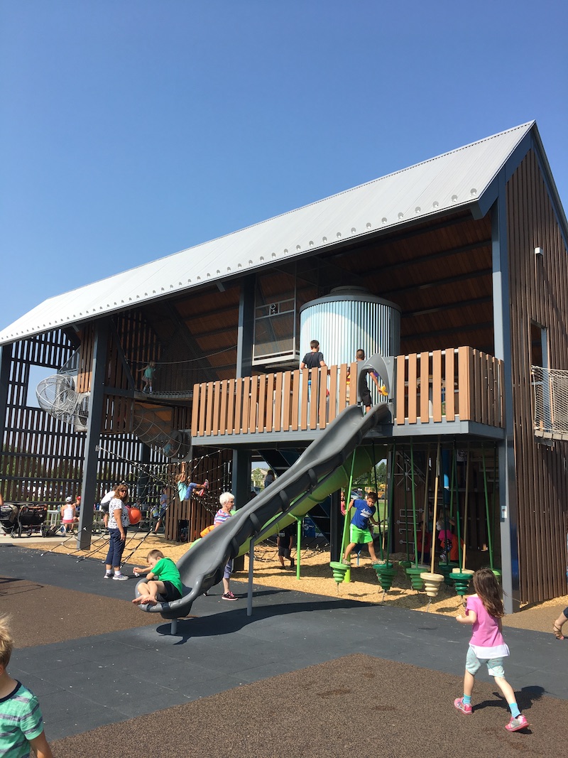 The City of Fort Collins is committed to developing parks with Themes to encourage our youth and young at heart to get outside and play. The Twin Silo Park is a modern day twist on elements that one would find on a farm. The Twin Silo’s are actual Silo’s that were re-established and renovated then placed into the park to create the emphasis of the farming theme. The Silo’s have been turned into climbing areas and slides that connect the 2 Silo’s…they are super cool. The modern day barn design sits directly next to the Silo’s where kids can challenge themselves with interactive games and a narrow 13 feet high suspension Bridge.